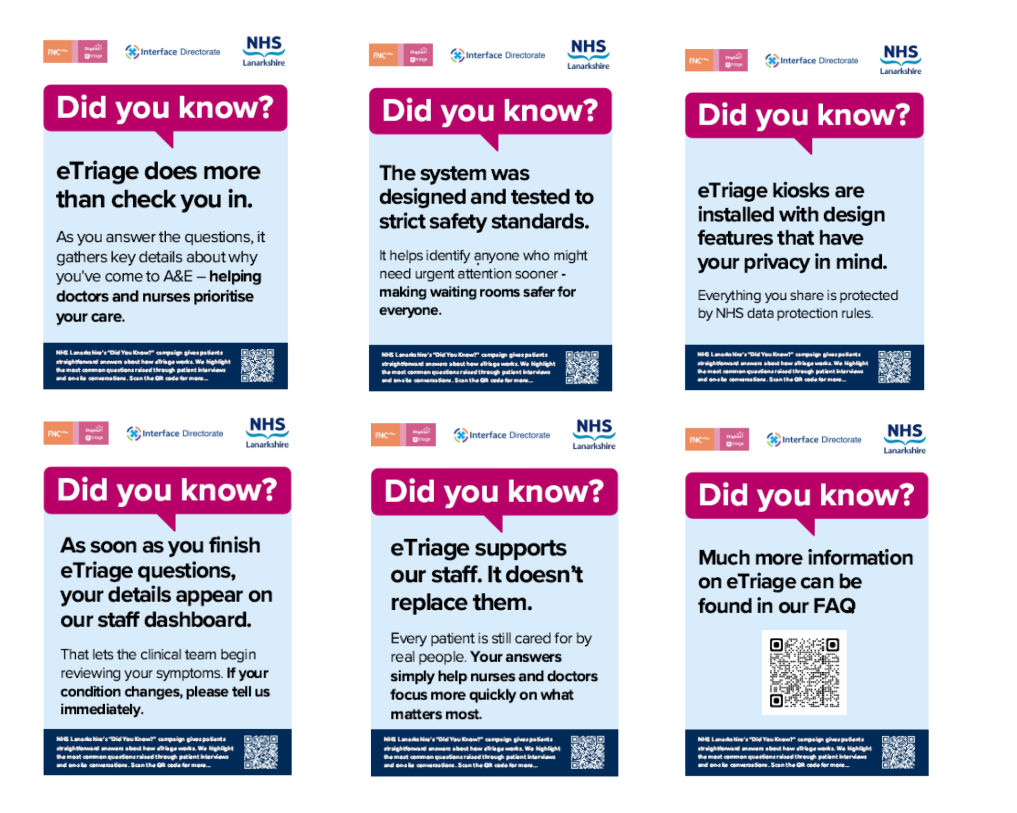- Since the first phase of eTriage went live earlier this year, the project team has been gathering insight from patients and visitors. Acting on feedback, NHS Lanarkshire has produced a refreshed public information suite, including: